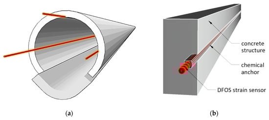 Diagnostics and assessment of the structural performance of collectors and tunnels require multi-criteria as well as comprehensive analyses for improving the safety based on acquired measurement data. This paper presents the basic goals for a structural health monitoring system designed based on distributed fiber optic sensors (DFOS). The issue of selecting appropriate sensors enabling correct strain transfer is discussed hereafter, indicating both limitations of layered cables and advantages of sensors with monolithic cross-section design in terms of reliable measurements. The sensor’s design determines the operation of the entire monitoring system and the usefulness of the acquired data for the engineering interpretation. The measurements and results obtained due to monolithic DFOS sensors are described hereafter on the example of real engineering structure—the Burakowski concrete collector in Warsaw during its strengthening with glass-fiber reinforced plastic (GRP) panels.