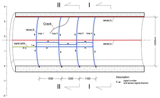 The sensor locations were determined by reference to similar sewage collector and tunnel monitoring systems, including those performed in 2016 as a part of the Grand Paris Express [] project and currently being implemented for the entire investment, which is expected to be completed in 2030 []. Four loops in the most weakened part of the collector section were implemented in a manner similar to the design of the system used in the Royal Mail Underground Tunnel in London []. Experiences of other researchers have proven the robustness of fiber-optic sensors for structural monitoring under difficult conditions in cross-sections of tunnels [].