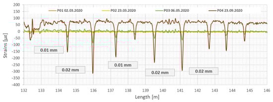 Strain profiles measured by sensor (T) along the test section showing the primary discontinuities in the concrete collector closing during strengthening process. Example section from 132 to 146 m. Measurement P01—after installation of GRP panels, P02—during grout injection, P03—after completed grout injection, P04—after filling the collector with sewage.