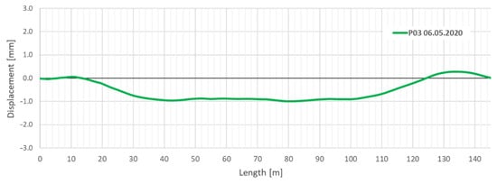 The mid-length displacement (settlement) of the collector determined after the grout injection process relative to its ends was about 1 mm, as shown in Figure 16.