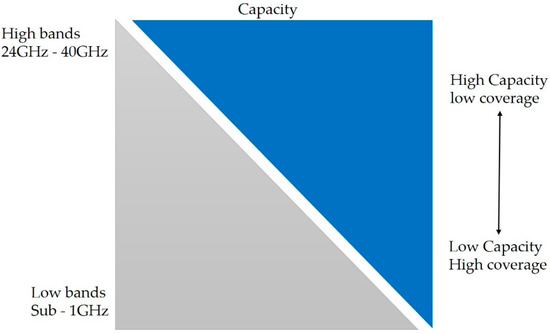 The 5G NR deployment in high bands (i.e., 24 GHz–40 GHz) offers more spectrum, which can boost the network capacity and the data rate by several folds [14]. In higher frequency bands, the signal propagation loss is too high; that will significantly reduce the individual cell site coverage, as shown in Figure 2 [13,15]. The individual cell site coverage will be around 100 m (in radius) in higher frequency bands (i.e., 24 GHz–40 GHz) compared to several kilometers in 4G networks [14,16]. Therefore, the MNO must deploy hundreds of new small cells (e.g., 100 m cell radius) compared to one large cell site (e.g., Macrocell will have several km in radius) to ensure the end-users’ connectivity for the same area. The 5G network will require a very high level of network availability (i.e., 99.999%) and very high network reliability (i.e., 99.99%) that will require 100% network coverage [4,17,18], meaning that the 5G network coverage planning will be one of the main priorities for the MNO. It will ensure 5G connectivity and meet all the 5G network key performance indicators (KPI) (e.g., 99.99% network availability, 99.99% network reliability, highest bitrates (~20 Gb/s), and lowest latencies, etc.).