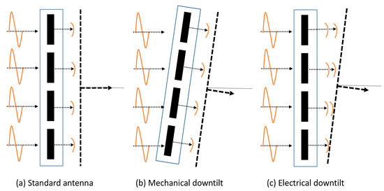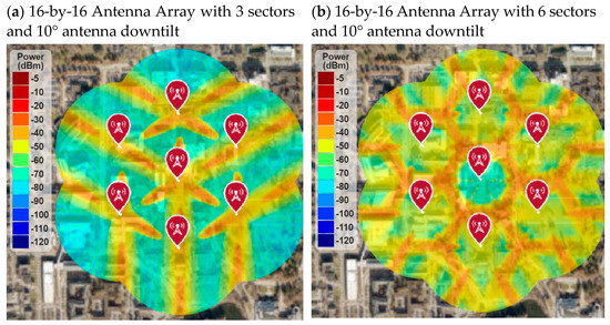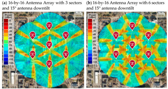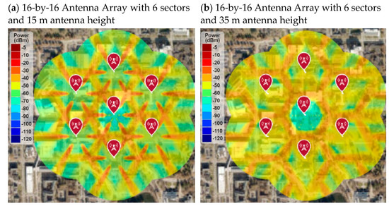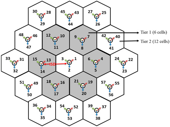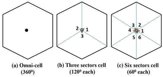 Three transmitters correspond to each cell sites, as shown in Figure 4. Each transmitter can be designed with a single antenna element or antenna array that contains n numbers of antenna elements. Since the 5G network will use the higher frequency bands (i.e., millimeter-wave bands), it will allow integration of a large number of antennas in a single array (e.g., 8-by-8 rectangular array) with a small form factor. According to IMT-2020 [16], the 5G base station can have up to 256 antenna elements with an operating frequency of 30 GHz.