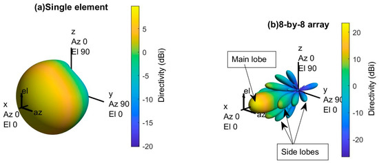 An antenna array (or phased array) is a set of two or more connected antennas which work together as a single antenna to transmit or receive radio waves, shown in Figure 5 [19,20]. Typically, the single element antenna provides a relatively wide radiation pattern that is low in gain (directivity), but the radiation pattern of an antenna array provides a narrower beam, and it can achieve higher gain (directivity), which is required for long-distance communications [19]. This paper uses the base station antenna characteristics defines by the ITU-R report for 30 GHz operating frequency [16]. Figure 6 shows the 3D radiation pattern of a base station with a single element and an array with 8-by-8 antenna elements. Several MATLAB toolboxes (e.g., Antenna Toolbox, Phased Array System Toolbox, etc.) are used for the Antenna design and simulations.