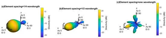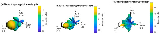Figure 7 shows the 3D radiation pattern of an 8-by-8 uniform phased array with different spacing (i.e., one-quarter wavelength, one-half wavelength, and one wavelength) between elements. The main lobe becomes more directive (high gain) as the element spacing increases, but the number of sidelobes and sidelobe power increase. The number of sidelobes and the sidelobe power must be reduced to direct the maximum power toward the main lobe.