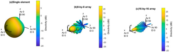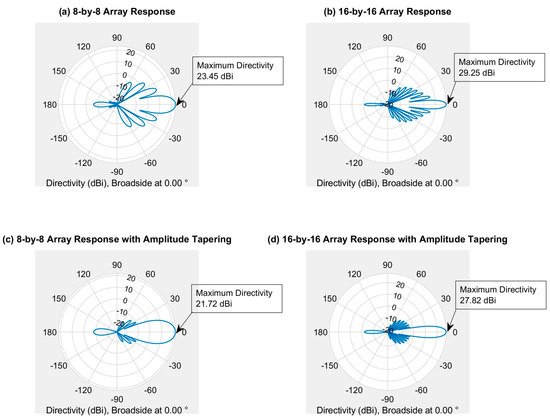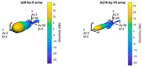 Figure 9 shows the 3D radiation pattern of the uniform phased array antenna (i.e., 8-by-8 and 16-by-16 array) with Dolph–Chebychev amplitude tapering. In this simulation, 30 dB amplitude tapering is applied to reduce the sidelobe power. It is found that the amplitude tapering reduces the sidelobe power significantly for both arrays.