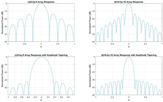 2D radiation pattern of the array (i.e., 8-by-8 and 16-by-16 array) with and without amplitude tapering.