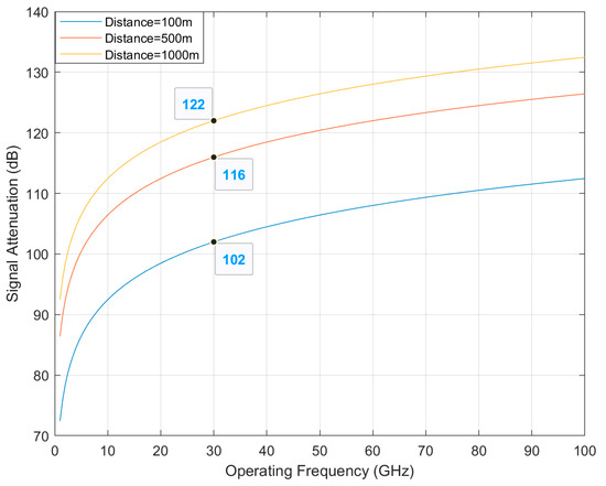 Figure 13 shows the total free space signal attenuation versus operating frequency. It is found that the total signal attenuation increases with the operating frequency. The total signal attenuation also increases significantly if the propagation path increases, which is why the 5G networks limit the cell range to 100 m for high-frequency bands.