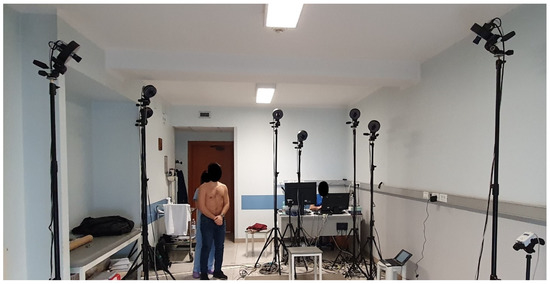 Stereophotogrammetric MoCaps are instruments used in the field of biomechanics in a range of configurations and applications [36]. A MoCap typically consists of two or more cameras with infrared emitters that are able to track the trajectories of a number of photoreflective (active or passive) markers that are placed on a generic moving object [36,37]. When a marker is recorded from the cameras, the tridimensional trajectory can be retrieved from the planar camera frame with a resolution of more than 0.5 mm [12]. In clinical practice, MoCaps are used to investigate several aspects related to gait and posture [38,39,40], to indirectly estimate physiological parameters (e.g., breathing volumes [41,42]) from the 3D chest wall movements and to assess complex shape changes in various application scenarios [43,44].