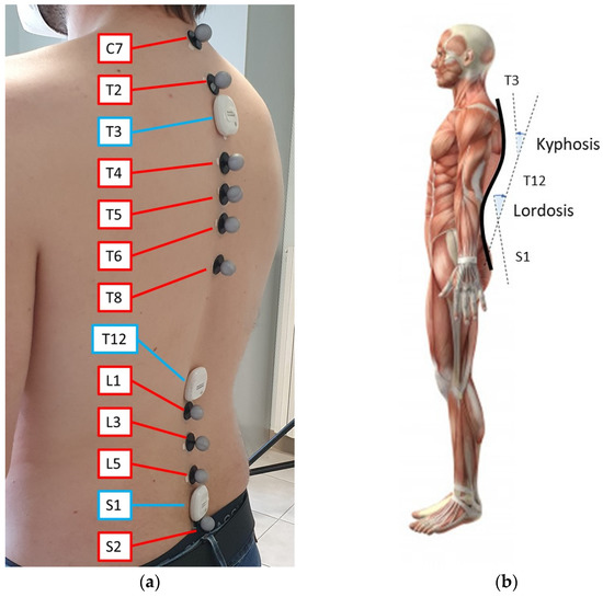 Experimental setup. (a) MIMU locations are indicated in blue, MoCap markers in red; (b) Scheme of kyphosis and lordosis. The angles calculated in the sagittal plane with the MIMU sensors at T3, T12 and S1 are indicated by dashed lines.