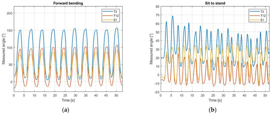 An exemplary time evolution of the angles in T3, T12 and S1 measured with the MIMU system is shown in Figure 5 for the forward bending and the sit-to-stand exercises recorded from one volunteer.