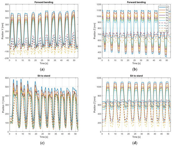 MoCap data. The position of every marker is shown in the sagittal plane, defined by the Y and Z axes of the calibration frame. (a) Coordinates in the Y axis during forward bending; (b) Coordinates in the Z axis during forward bending; (c) Coordinates in the Y axis during sit-to-stand; (d) Coordinates in the Z axis during sit-to-stand.