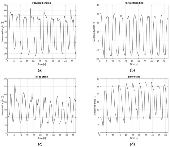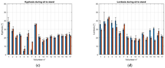 Thoracic kyphosis and lumbar lordosis. The difference in amplitude between the MIMU sensors represents the thoracic kyphosis (T3-T12) and lumbar lordosis (S1-T12). (a) Kyphosis angle during forward bending; (b) Lordosis angle during forward bending; (c) Kyphosis angle during sit-to-stand; (d) Lordosis angle during sit-to-stand.