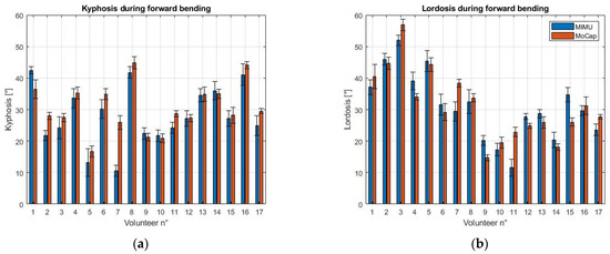 The thoracic kyphosis and lumbar lordosis were calculated from the MoCap data with the polynomial method presented in Section 2.4. The results for the average kyphosis and lordosis values for each volunteer and for each exercise (i.e., forward bending and sit-to-stand), obtained with the MIMU and the MoCap systems, are presented in Figure 8.