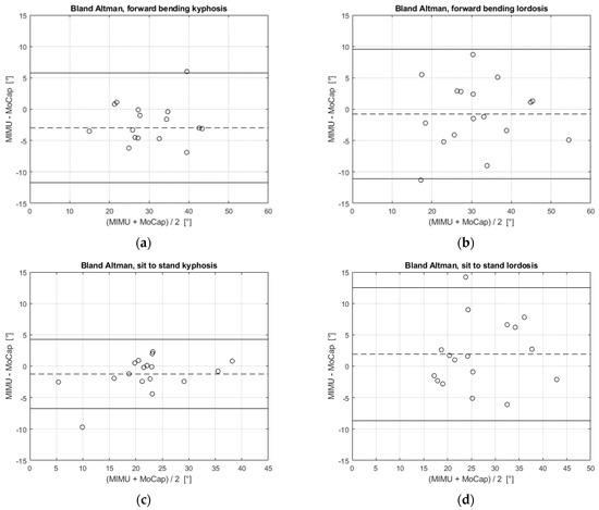 Bland–Altman test. Each of the 17 subjects is represented by the average of the kyphosis or lordosis angle accordingly and is plotted as a hollow circle in the graphs. The MoD is the dashed line, the LoA are the continuous lines. (a) Kyphosis angle during forward bending; (b) Lordosis angle during forward bending; (c) Kyphosis angle during sit-to-stand; (d) Lordosis angle during sit-to-stand.