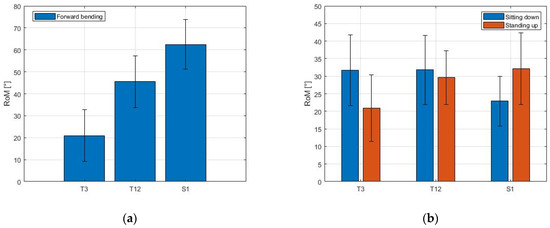 The ROM increased along the spine during the forward bending, from T3 to S1 (see Figure 10a). During the sit-to-stand exercise, the ROM of the three zones exhibited a different behavior when considering the sitting down and the standing up phases (Figure 10b). During the sitting down phase, the ROM of T3 and T12 was similar (31.7 ± 10.0° and 31.8 ± 9.8° for T3 and T12, respectively) and decreased in correspondence with S1 (mean value 22.9 ± 7.1°). During the standing up phase, the ROM of T3 was 20.9 ± 9.5° and increased in correspondence with T12 (29.6 ± 7.6°) and S1 (32.1 ± 10.2°).