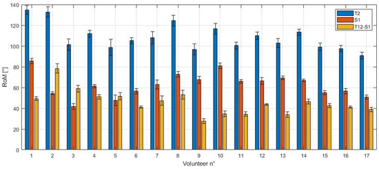 The peak value of T12 ranged from 90.8° to 134.8°, with a maximum standard deviation within the same subject of 7.9°. The peak value of S1, which coincided with its ROM, ranged from 41.7° to 85.5°, with a maximum standard deviation of 5.1°. The ROM of T12, given by the difference between the peak value of T12 and S1, is also called the lumbar contribution. Its values ranged from 27.7° to 78.4°, with a maximum standard deviation of 4.5°, and it was almost always lower than the pelvic contribution (S1). The average percentual contribution between lumbar and peak thoracic angle (i.e., the lumbo-pelvic rhythm) was calculated as the percentual ratio between T12-S1 (yellow bar) and T12 (blue bar). It was equal to 41.8 ± 8.6%.