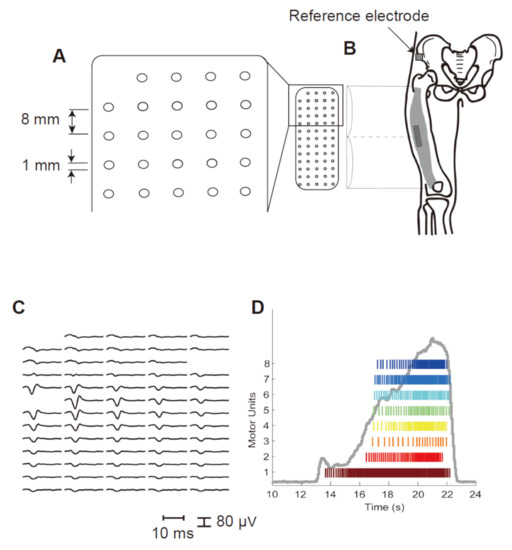 - Holobar, A.; Minetto, M.A.; Farina, D. Accurate identification of motor unit discharge patterns from high-density surface EMG and validation with a novel signal-based performance metric. J. Neural Eng. 2014, 11, 016008. [Google Scholar] [CrossRef] [PubMed]