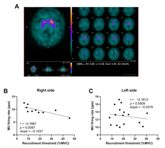 Representative data of DAT-SPECT (A) and MU firing behavior (B,C) of a female with Parkinson’s disease (71 years old, UPDRS Part III score = 8) during the ramp-up contraction task. Neurodegeneration can be seen predominantly on the right side. Regarding the MU firing behavior the correlation between the firing rate and recruitment threshold showed a negative correlation on the right side, while no correlation was observed on the left side.
