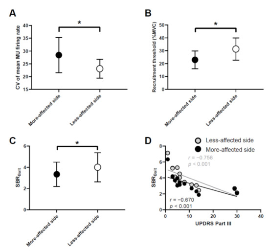 The more-affected side showed a lower knee extensor torque, recruitment threshold, and SBRBolt, and a higher CV of the mean MU firing rate than the less-affected side. Previous studies have reported that people with PD exhibit laterality in muscle strength, abnormal MU firing behavior, and degeneration of the central nervous system [11,26]. These previous findings are in accordance with the results of this study showing that compared with the less-affected side, the more-affected side exhibited less muscle strength, larger abnormalities in MU firing behavior, and more severe degeneration of the central lesion.