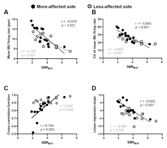 Strong correlations were observed between the SBRBolt and mean MU firing rate, CV of the mean MU firing rate, cross-correlation function, and linear regression slope on the more-affected side (r = −0.818, p < 0.001, r = −0.850, p < 0.001, r = 0.740, p = 0.003, and r = −0.822, p < 0.001, respectively, Figure 4). The less-affected side showed moderate correlations between the SBRBolt and the mean MU firing rate and CV of the mean MU firing rate (r = −0.7621, p = 0.001, and r = −0.809, p < 0.001, respectively, Figure 4A,B).