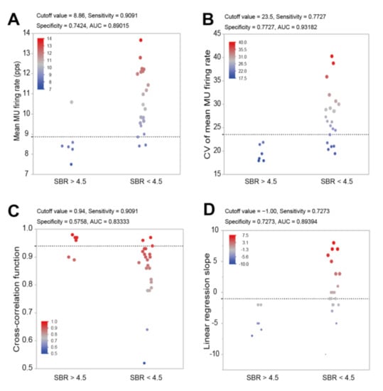 The progression of neurodegeneration leads to the worsening of physical symptoms, and in this study, we found a significant correlation between SBRBolt, which reflects the activity of dopaminergic transporters and the integrity of dopaminergic pathways, and UPDRS Part III scores, which reflect physical function (Figure 3D). This finding is in accordance with those of previous studies showing a correlation between the clinical symptoms and time course of progressive PD [3,32]. Importantly, we found that SBRBolt was associated with the mean MU firing rate, CV of the mean MU firing rate, cross-correlation function, and linear regression slope of the mean MU firing rate and recruitment threshold (Figure 4). Previous studies have indicated that abnormalities in MU firing behavior in people with PD are due to central nervous system degeneration [11,33], but no studies have directly examined the degree of central nervous system degeneration and abnormalities in MU activity. The lower value of the SBRBolt, the greater degeneration of dopaminergic neurons [25]. Furthermore, we calculated cutoff values of the mean MU firing rate, CV of the mean MU firing rate, cross-correlation function, and linear regression slope to predict the severity of degeneration of lesions (SBR > 4.5 or SBR < 4.5). Since this study included only people with PD, there were few subjects with SBR > 4.5, but the AUC of each ROC curve was high (Figure 5), suggesting that abnormalities in MU firing behavior may be used to predict central nervous system degeneration.