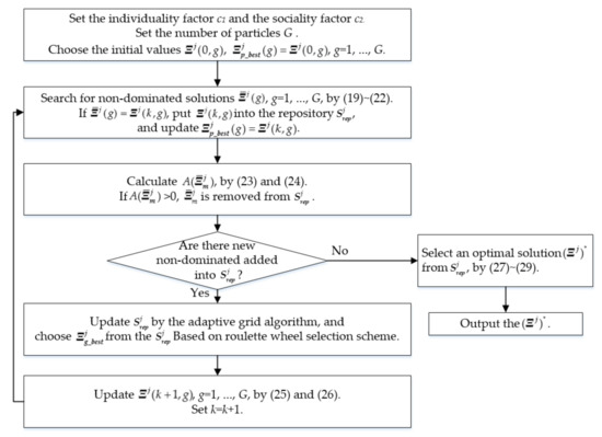 Only if is the non-dominated solution of (19) will it be included in the repository , which is the set of all of non-dominated solutions of (19). The best solution achieved by the gth particle, denoted , is updated using this non-dominated solution generated by the gth particle, that is, = . With reference to (22), if is not generated in the current kth iteration, remains unchanged.