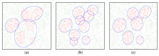 The ellipsoid parameters, such as size, centers, and orientation, are optimized using MOPSO integrated with the GKA, as described in Section 2 and Section 3. These ellipsoid parameters are calculated under the condition that the total number of ellipsoids used to approximate the jth class decision region is assigned in advance j = 1…p. If is too small, the jth class samples might be included in an insufficient number of ellipsoids, resulting in several ellipsoids having large sizes. It is possible that certain samples that do not belong to the jth class are included in these large ellipsoids. Moreover, samples other than those belonging to the jth class might be included because an insufficient number of ellipsoids is assigned to model the jth class samples. A binary-class dataset with 1000 samples in each class is illustrated in Figure 3. The samples in either class 1 or class 2 are randomly generated within the range [0, 3] on X and Y axis, respectively. The problem caused by a small is illustrated in Figure 3a. Conversely, the jth class samples might be included in too many ellipsoids if is too large. This results in a scenario where several ellipsoids overlap with each another, resulting in the ellipsoids being learned inefficiently, as illustrated in Figure 3b. If a suitable is assigned, as illustrated in Figure 3c, the learning result leads to a set of ellipsoids with of the appropriate size, center, and orientation.