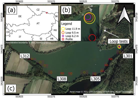 Location of the site within Austria and its neighboring countries (a). Aerial view of the test site to evaluate the effect of the loop size (b) and the measurement positions of the profile (c). Grid coordinate system: UTM 33N.