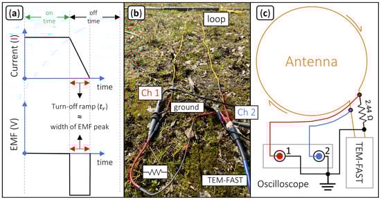 The current turn-off process induces a large negative and nearly constant voltage, also referred to as electromotive force (EMF, e.g., [12]). In practice, the duration of the EMF peak is directly related to as illustrated in Figure 4c. We measure using a DSO 1084F oscilloscope manufactured by Voltcraft. In channel one, we connect a shunt-resistor with a resistance of to measure the current in the loop and, in channel two, we measure the induced EMF (see Figure 4a,b). The TEM-FAST system estimates automatically from the loop size and the injected current. Typical values range from 3 to 4 for loops with radii of 6.2 m and 11.9 , respectively. In this study, we evaluate the validity of this estimation.
