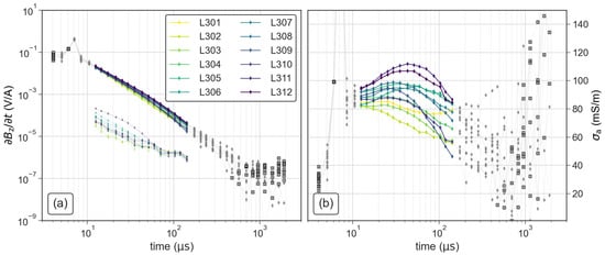 Our first processing step consists in plotting all measured transients and selecting a time range (–) based on a visual assessment of the data quality. Sections with a smooth decay and the absence of negative readings indicate sufficient data quality. We also visualize the late-time apparent conductivity (), using the approach described in terms of the apparent resistivity by [31], which reduces the dynamic range of the curves and facilitates the detection of less obvious outliers. The three soundings of campaign 1 were filtered to individual time ranges, because each measurement was done with different loop-antenna sizes (see Table 2). In the case of campaign 2, we conducted all soundings with the same loop ( ) and deleted measurements outside of the range between 12 μs and 150 , considering that readings outside of this range deviated from a smooth shape as presented in Figure 5.
