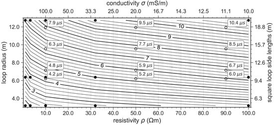 Minimum effective time (in ) as a function of loop radius (or square-loop length) and subsurface resistivity (or conductivity). The filled circles mark the values computed by [39], which were used as input for the 2D interpolation to obtain the continuous contour lines shown here. Empty circles show the values of corresponding to our four circular loops (6.2 m, 7.2 m, 9.5 m and 11.9 ) and three different subsurface-resistivity values (10 Ωm, 50 Ωm and 90 ).