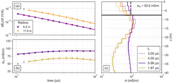 We use the same experimental layout of the ramp measurements to investigate the influence of the antenna size on both the measured data and the inverted model. The observed signal level significantly increases with increasing antenna size (Figure 10a). After initial filtering to the same time range (12 to 150), we removed additional voltage readings where the model response did not fit the measured data. Especially, at late times ( ), the readings of the smallest loop resulted in a poor fit in the inversion (not shown here) and were removed as noisy measurements. Accordingly, the longest transients fitted in the inversion are those corresponding to larger antennas with a higher magnetic momentum and the shortest transient is the one related to the smallest antenna size. However, the earliest useful reading that could be fitted in the inversion was measured with the smallest loop antenna, which is due to the shorter turn-off ramp. The apparent conductivity presented in Figure 10b shows that the data measured with the two largest loops align almost perfectly. The apparent conductivity measured with the smallest loop is increased by / compared to the other to curves.