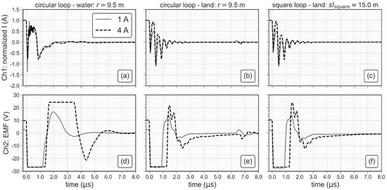 Comparison of ramp measurements with different geometries (circular and square loop), different injected currents (1A and 4) and different average conductivities of the subsurface ( / on water and / on land). (a–c) show the normalized current measured at the shunt resistor and (d–f) show the induced voltage (electromotive force—EMF) in the antenna cables after shutting the transmitter current off.
