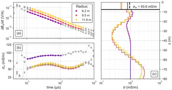 TEM soundings and inversion results obtained with circular antennas with radii of 6.2 m, 9.5 m and 11.9 in terms of the measured and inverted (a) impulse response and (b) apparent conductivity of TEM data. Grey symbols in (a,b) represent readings that were removed as outliers and the solid lines indicate the model response. (c) Inverted models for each of the investigated antennas. The black horizontal line represents the lake bottom at the sounding position and the dashed black vertical line the water conductivity () measured with the CTD probe.