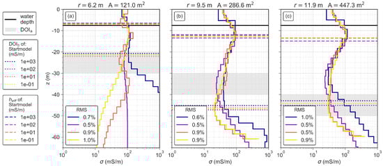 Inverted conductivity models using four different homogeneous start models for circular antennas with radii of (a) , (b) , and (c) . Each subplot shows the minimum effective sounding depth , the estimated DOI range and the calculated DOI of the corresponding models. The colors of the models correspond to the respective colors of the DOI and DOI.