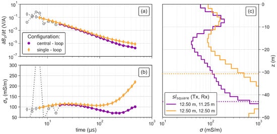 TEM soundings and inversion results obtained using the central-loop and single-loop configuration in terms of (a) impulse response and (b) apparent conductivity of the TEM data. Grey symbols in (a,b) represent readings that were removed as outliers and the solid lines indicate the model response. (c) Inverted models for both investigated configurations. The dotted line indicate the corresponding DOI.