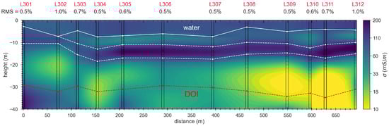 with being the inverted resistivity at a certain depth z. Another approach to determine the DOI is based on assessing the sensitivity of each layer by evaluating the Jacobian matrix (e.g., [37]), which offers the additional advantage of providing the sensitivity of each layer individually to identify possible ill-determined parts of the model. Such an approach was also used to evaluate the DOI in the inversion of seismic surface wave data [38]. In our study, we use only the DOI and DOI approaches as described above.