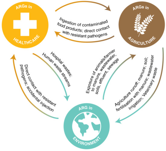 Commonly cited AMR transmission routes for antibiotic resistance genes (ARGs) between healthcare, agricultural and environmental domains.