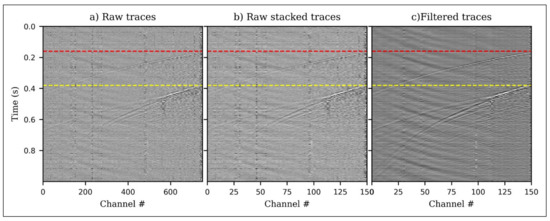 The iDAS had a gauge length of 10 m and a channel spacing of 1 m along the cable. Data was recorded continuously at a sampling frequency of 2000 Hz throughout the injection period of ~11 days in April–May, 2019. Forty microseismic events were detected and located with moment magnitudes, Mw, in the range −1.653 to −0.519 [41]. For detection of microseismic events, every five traces were stacked to boost the signal-to-noise ratio (SNR) and reduce the data volume. For each stacked trace, the SNR at each time step was computed. This is accomplished by measuring the root mean square (RMS) amplitude 24 ms before and 6 ms after each time sample using sliding windows. The ratio of the RMS values before and after a particular period represents the SNR at that point in time. It will be greatest at the start of an event’s arrival, when the signal is located in the after window and the background noise is located in the before window. A 300 Hz minimum phase low-pass and 2D median spatial filter were applied to attenuate the noise and remove the common-mode noise, respectively. Because DAS only measures single component strain (or strain-rate), the events were constrained to a 2D vertical grid. Figure 1 shows sample traces from the field data.
