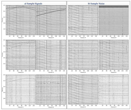 Sample synthetic data (a) DAS microseismic events contaminated with ambient noise from field data, (b) sample DAS ambient noise extracted from field data.