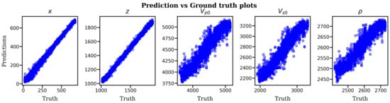 The test dataset comprised of 5000 DAS microseismic events from 50 distinct velocity models was used to evaluate the performance of the trained network. As a first step in evaluating the model’s performance, we input the entire test dataset and plot the scatter diagram (Figure 6) of predictions vs. ground-truth values to determine the correlation between the predictions and the actual values. The scatter plots for both location and velocity model estimates show strong positive correlation between the predicted and the ground-truth values, indicating that deep learning is capable of inverting the raw DAS microseismic data for the detection, location and velocity model inversion.