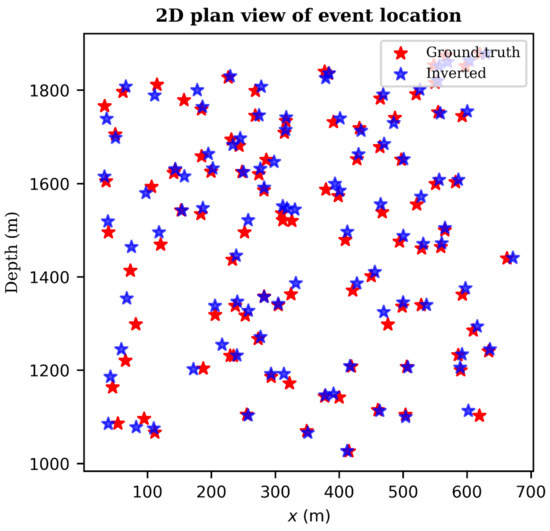 In order to visualize the relative locations of the predicted and ground-truth events, we plot a 2D plan view projection of the event locations as shown in Figure 8. For clarity, we plotted only 100 events from a single velocity model. From Figure 8, it is clear that the predicted event locations (blue stars) almost perfectly match the ground-truth locations (red stars) with very minimal deviations in some cases.