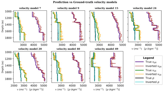 Further, we compare the velocity model parameters from the predictions against the ground-truth values in the velocity versus depth profiles displayed in Figure 9 to quantify the accuracy of the velocity model predictions. Evidently, the predicted velocity models, to a large extent, match the patterns of the ground-truth models.