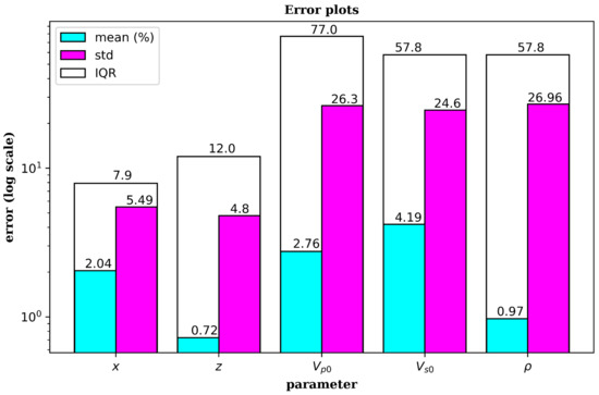 Error bar graph for the location and velocity model parameters inverted by deep learning. The vertical scale is logarithmic while the parameters are shown on the horizontal axis with their respective values at the top of each bar. Cyan, purple and white bars represent the mean absolute error, standard deviation and the interquartile ranges, respectively.