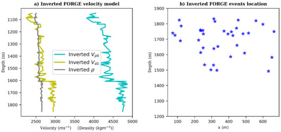 Inversion results: (a) Velocity model of FORGE estimated by the neural network. Cyan, yellow and grey curves are the raw patterns output of vp0, vs0 and ρ by the network, (b) Events locations.
