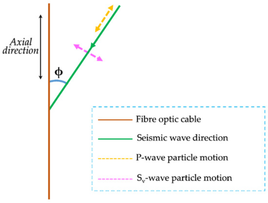 It is worth noting that this directionality is linked to the phase of the seismic wave that arrives at a specific incidence angle. If the angle of incidence, ϕ, (Figure 12) is defined as 0 degrees for arrivals propagating along the fiber’s axial direction and 90 degrees for arrivals propagating perpendicular to the optical fiber, the sensitivity to P-wave arrivals is greatest for angles of incidence approaching 0 and least for angles approaching 90 degrees. On the contrary, because S-waves propagate perpendicular to directions of motion, their sensitivity increases as the incidence angle approaches 90 degrees and diminishes for angles closer to 0.
