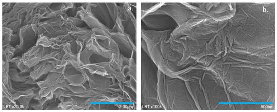 The morphological aspects of the synthesized sample were investigated by SEM technique. The SEM micrographs with different magnifications showed thin graphene sheets with wrinkled and folded areas (Figure 1a,b). The wave-like morphology of the sample may be due to the heteroatoms or defects present in the graphene plane.
