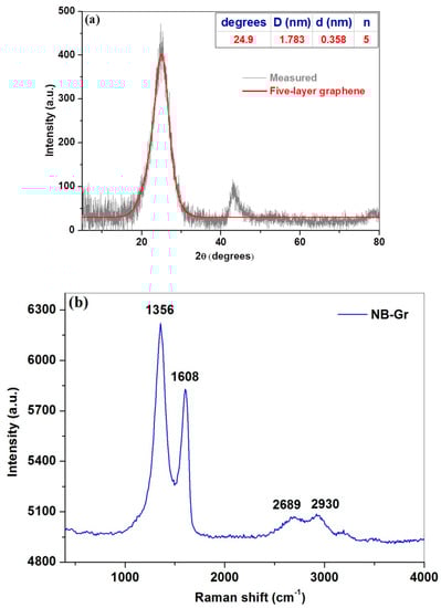 The structure of the NB-Gr sample was studied by X-ray powder diffraction (Figure 2). The XRD pattern of the sample shows a diffraction peak at 20~25°, corresponding to an interlayer spacing of about 0.358 nm. The size of graphene crystallites (D) was calculated using the Scherrer equation and was found to be 1.783 nm. The average number of layers was five.