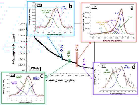 The core level high-resolution C 1s spectrum (Figure 3a), was deconvoluted into five different components accordingly: sp2 and sp3 carbon frameworks (284.2 eV and 285.1 eV, respectively); C-O/C-N (285.9 eV); C=O (287.1 eV); COOH/O-C=O/C-O-B (288.9 eV) and a small contribution assigned to the π→π* shake-up satellite band of graphitic carbons (290.6 eV). The oxygen atoms are bonded with the unsaturated carbon atoms present at graphene edge sites in the form of C–O (531.1 eV) and C=O/O–C=O (532.9 eV) groups and the high oxygen content confirms the presence of structural defects inside the sample (Figure 3b). The deconvoluted N 1s spectrum indicates three distinct components (Figure 3c) with binding energy (BE) at 398.2, 399.7 and 402 eV for the pyridinic (24.9%), pyrrolic (57.4%) and graphitic (17.7%) nitrogen, respectively. In addition, a weak signal from the boron atoms could be discerned from the XPS spectrum (≈192 eV), indicating the successful incorporation of boron into the graphene framework (Figure 3d). Previous theoretical calculations indicate that due to the large electro-negativity difference between boron and oxygen, O2 can be easily absorbed by the boron dopant, resulting in the formation of O2−, O2−, and O22− [40]. Furthermore, boron can substitute the carbon atom at the trigonal sites (BC3). Accordingly, the high resolution B 1s spectrum was fitted with two components corresponding to BC2O (191.1 eV) and BC3 (193.4 eV). The low boron doping level of graphene material can be explained due to the electron accepting nature of boron atoms which makes them more affinitive to oxygen compared to carbon [41]. The C/O, C/N and C/B atomic ratio were found to be: 0.79, 4.02 and 132.64.