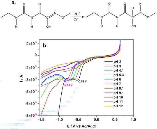 Electrochemical reduction of CYM (a); LSV recorded in BR solutions of various pH (2–12) each containing 10−3 M CYM; scan rate 10 mV/s (b).
